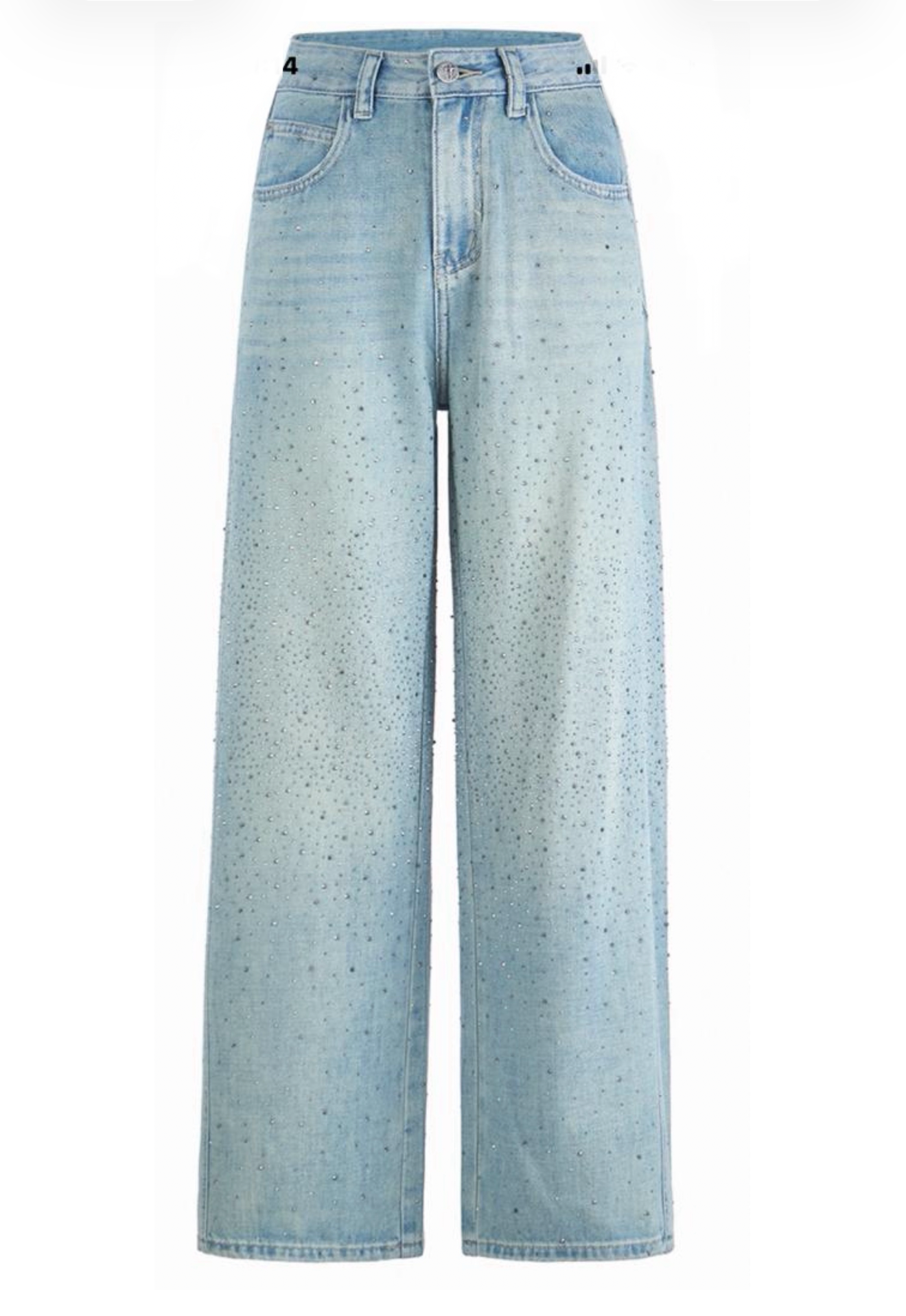 Designed to elevate your everyday denim, these light-wash, wide-leg jeans feature subtle rhinestone detailing that catches the light with every step. The flattering high-waisted fit and relaxed silhouette make them perfect for dressing up or keeping it casually chic.